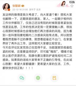 - 张靓颖就主动感染新冠发文道歉 希望大家都能健康