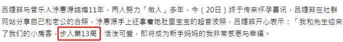 吕婕菲在个人社交账号上开心报喜,她表示,我和先生迎来我们的小房客,宝宝已经步入13周,活泼可爱即将成为新手妈妈的我,非常感恩和幸福。她还曝光了胎儿的性别,是一个男宝宝。