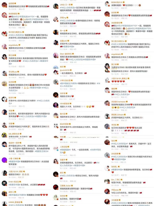 主流媒体邀请大家接力歌颂祖国,为祖国成立70周年华诞送祝福,娱乐圈的明星都出动进行转发并送上各式各样的祝福,这个也是很震撼。团结一心,都希望祖国更加繁荣、富强、和平。