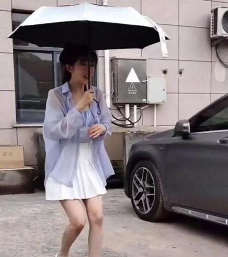 5月30日,张含韵从室内走出来,打着太阳伞,穿着浅紫色衬衫,白色短裙,非常的清爽漂亮,她刚走出来,外面的一群男代拍就沸腾了。纷纷喊道:“哇,真是好诶,好腿诶!