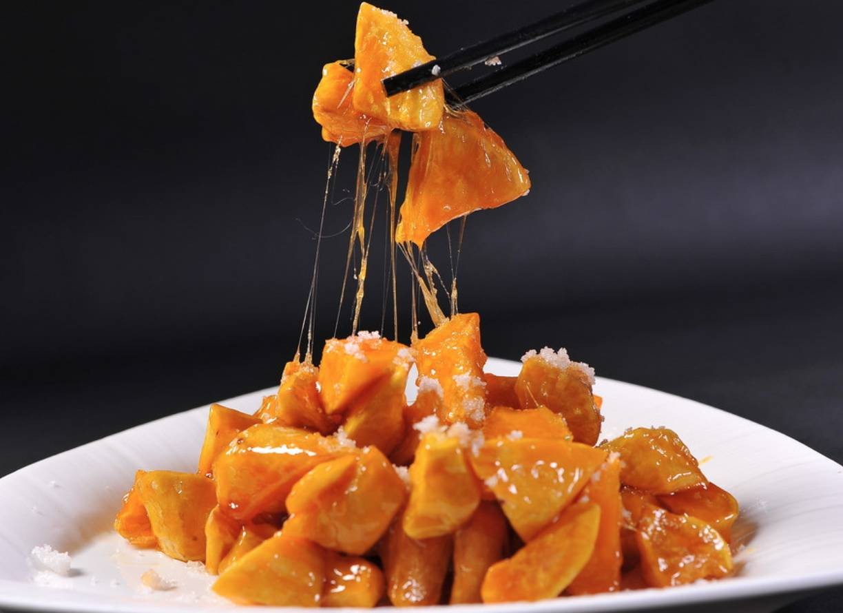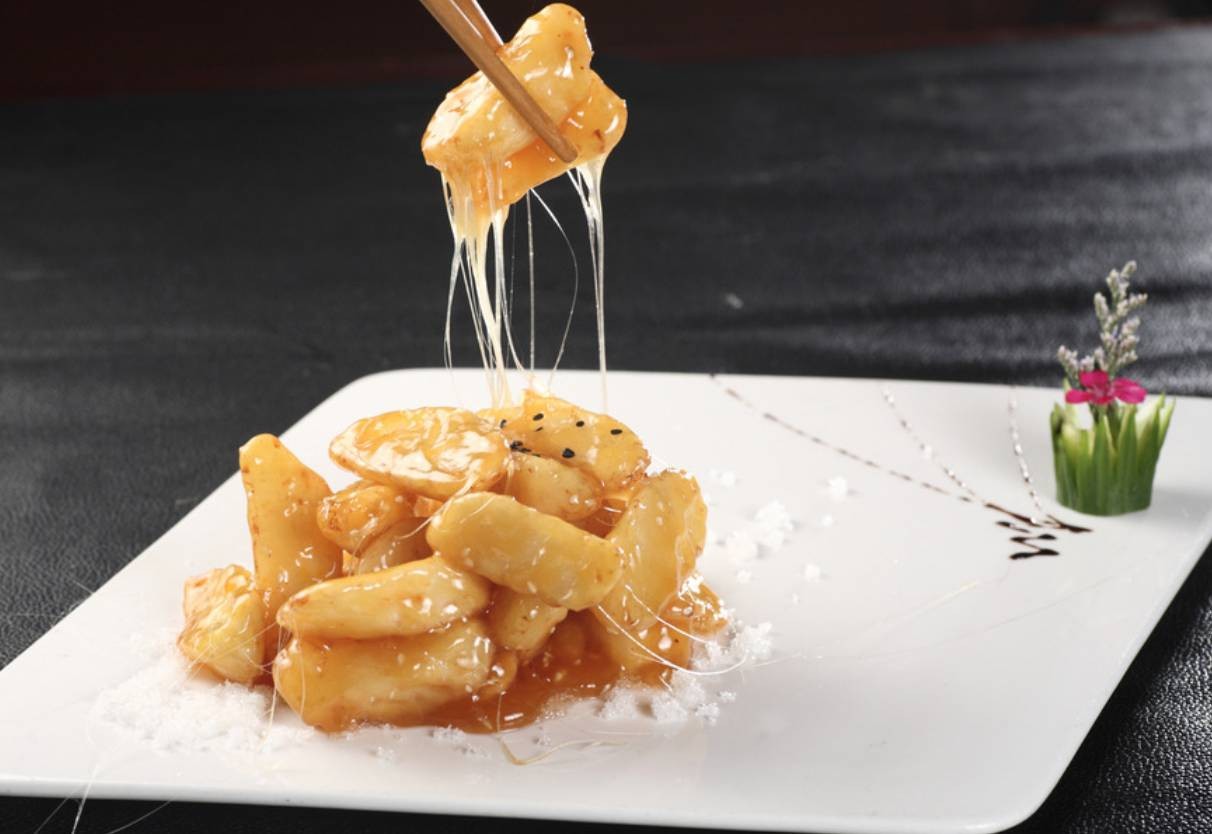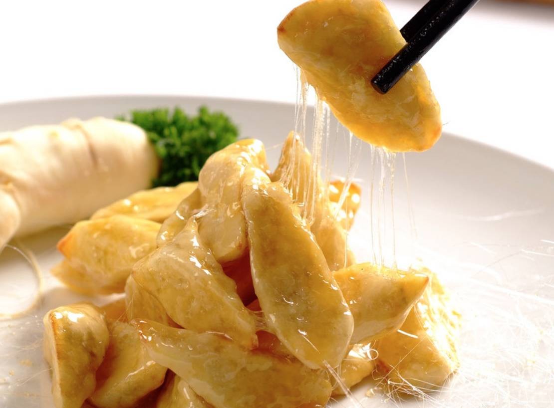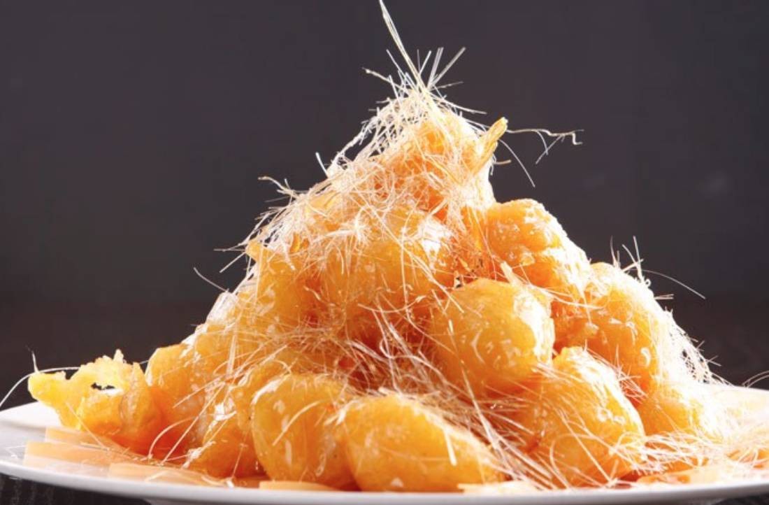 拔丝菜是山东省的汉族传统名菜,属于鲁菜菜系,拔丝白果的原料不是白果,而是以鸡蛋为主料,外观色泽金黄,块型光滑,味酸甜,外脆内软,糖丝绵长。春节盛宴,端上一盘拔丝菜,大家一齐下箸,金丝满席,趣味无穷。