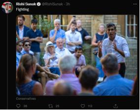 【环球网报道 记者 索炎琦】北京时间 13 日下午,英国保守党党首候选人之一、英国前财政大臣苏纳克在社交媒体 " 大喘气 " 发推:" 我们(是)",随后自己逐字在下方回复 " 在外面 "" 战斗 "" 为了 "" 每张 "" 选票 ",为自己拉票。这一举动引发一些网友争议,不少人延续其第一条推文接话讽刺:" 很糟糕 "" 要输了 "" 蠢货 "。