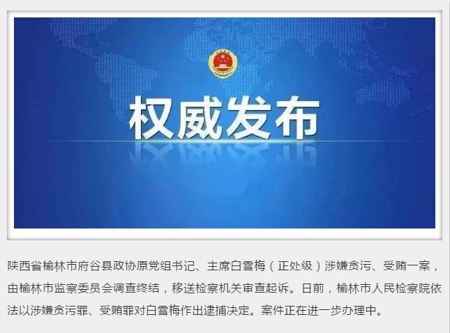 日前,榆林市人民检察院依法以涉嫌贪污罪、受贿罪对白雪梅作出逮捕决定。案件正在进一步办理中。