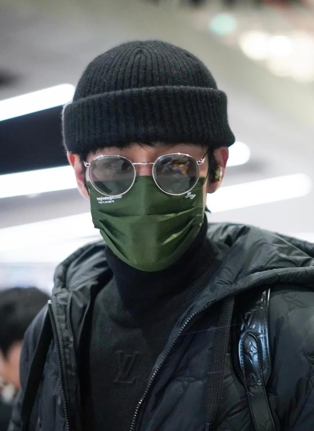 视频显示,他戴了一顶黑色针织帽、一副墨镜和一个绿色口罩,身穿一件黑色羽绒服,下搭同色系的阔腿裤,脚穿紫色鞋子,还背了一个黑色包,显得时尚感十足。