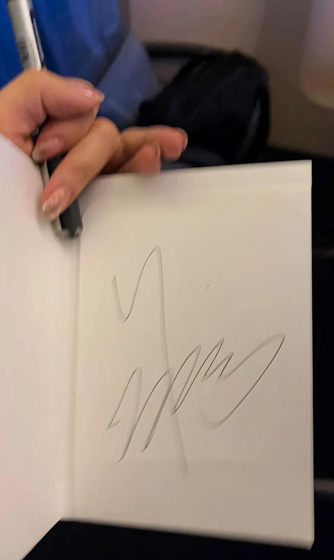 另外一位网友也在飞机上遇到了他。他就坐在网友的前面,还签了名。不得不说,他人怪好的,在机场上签名,在飞机上也签名,真的很平易近人呢。
