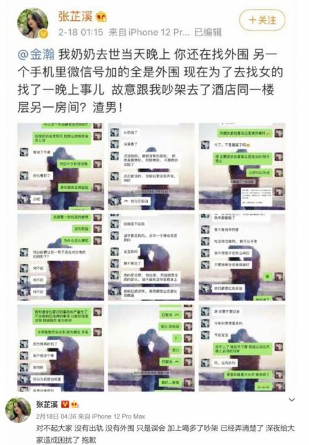 2月18日,女演员张芷溪在微博上爆料她的男友金瀚出轨的事,没想到春节过后的第一个“瓜”就这样出来了,顿时让网友们拭目以待。