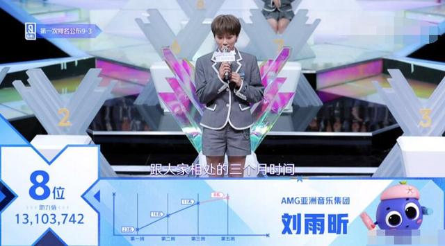 第八名:刘雨昕,票数:13103742票。主题曲的C位,节目中独树一帜的中性风格,成为她取胜的法宝。