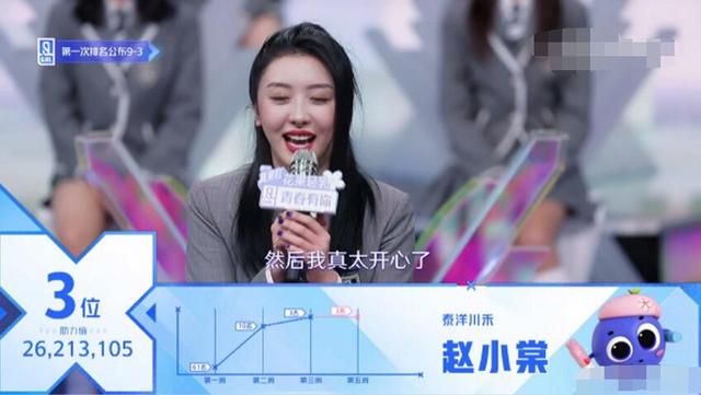 第三名:赵小棠,票数:26213105票。据悉,个人打投组成员不到300人,结果排名第三,有网友嘲她是吸血“大虞海棠”最成功的练习生。