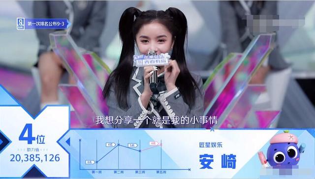第四名:安崎,票数:20385126票。小小的身体蕴藏着巨大的能量,舞台上的王者,每一次舞台表演都让人眼前一亮。