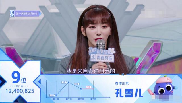 第九名:孔雪儿,票数:12490825票。作为《青春有你2》中首位进入A组的练习生,她在舞台上的表现可圈可点。