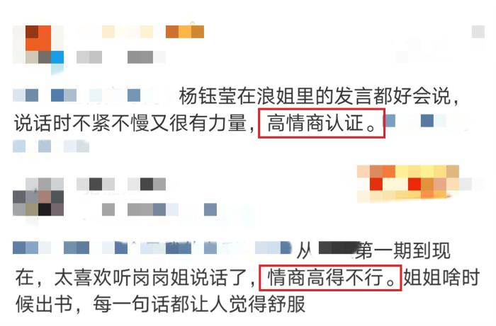 杨钰莹在节目中所表现出的高情商和得体的发言也被网友亲切地称作“语文课代表”,许多网友在看过节目后纷纷在网上留言称赞她:“说话时不紧不慢又很有力量,高情商认证。”