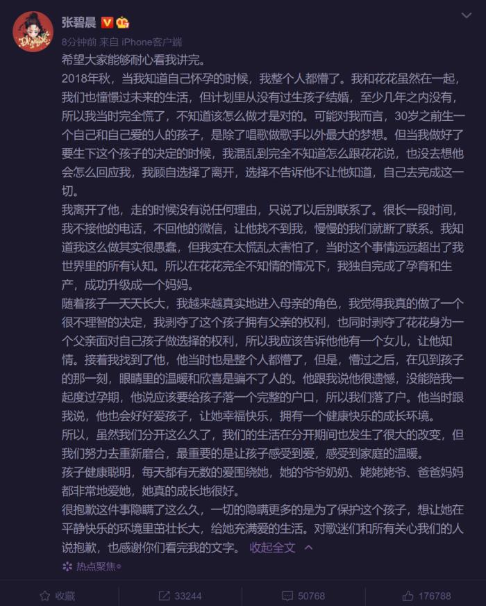 首先,在华晨宇宣布有一个孩子之后,很快张碧晨也通过社交平台发了一篇长文,内容很长,说明两个人是商量好了要一起公开有孩子的事实。