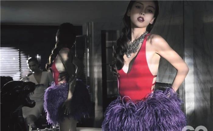 这组大片中杨颖还有这身造型,相比起前几身造型都是黑色的搭配这身造型看起来就艳丽了很多,红色的深V上衣搭配紫色羽毛裙。上身红色部分设计非常性感,胸前深V领口后背直接镂空的设计,只有几根带子连接。紫色的羽毛裙摆超短的设计,非常显腿长。但是杨颖这身造型的配色看着真的是没有太多的美感,紫色和红色的搭配看起来有些艳俗。