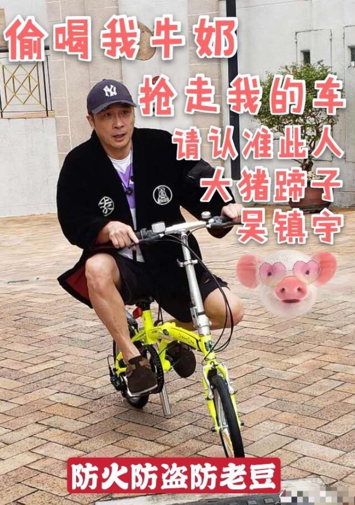 照片中的吴镇宇身穿黑色外套,戴着黑色的帽子,骑着费曼黄色的自行车。