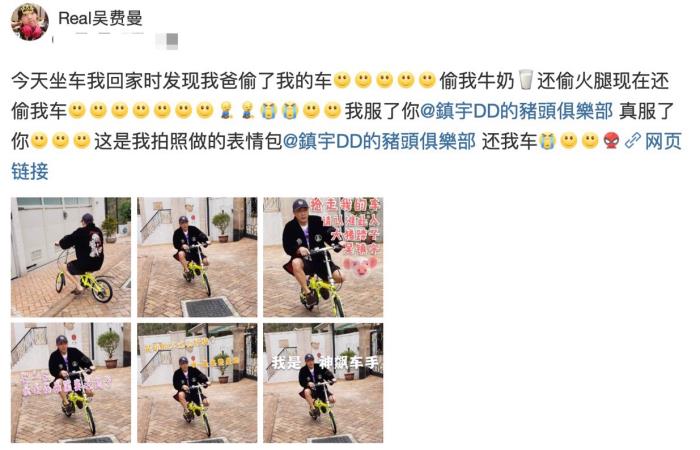 翻找费曼的社交平台相册,也经常可以看到吴镇宇的踪迹。费曼在社交平台发布了一组关于吴镇宇的照片,并配文:"偷我牛奶,偷我火腿,现在还偷我车。"费曼的配文加了许多哭泣的表情,看起来很是"伤心"。
