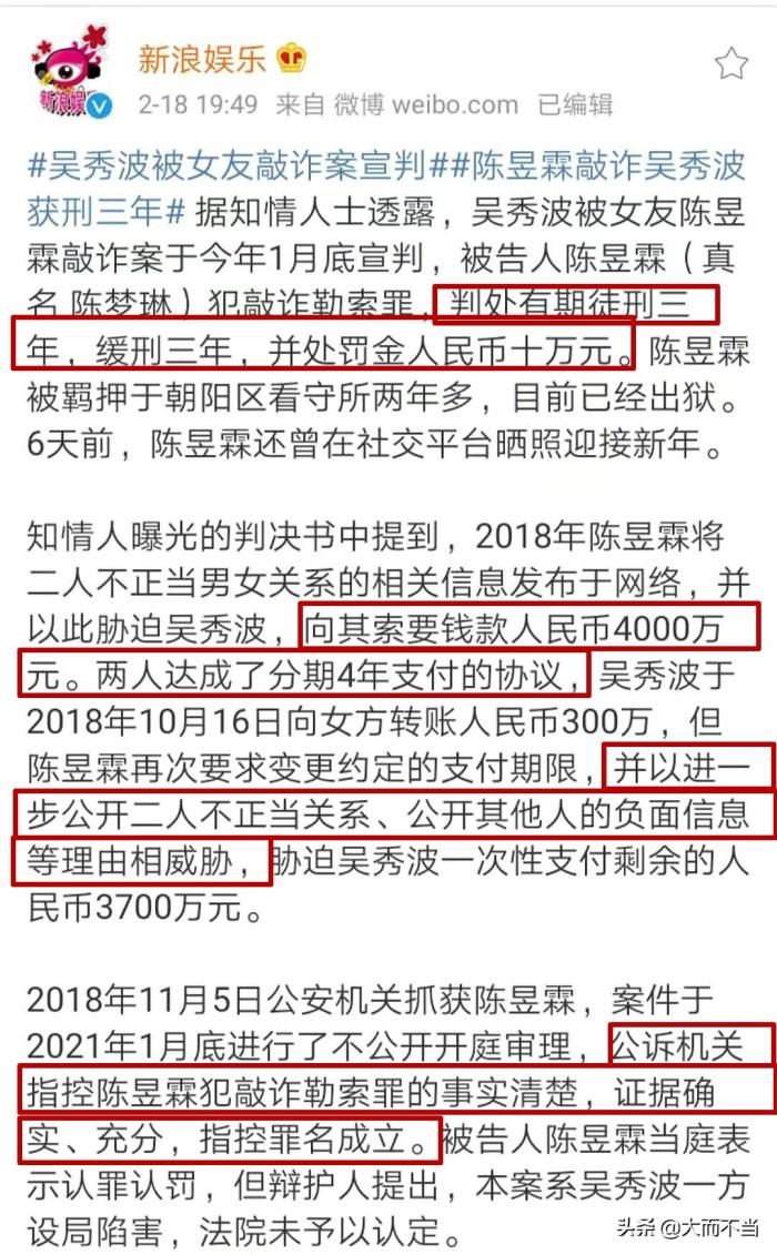 2月18据媒体报道,吴秀波被前女友陈昱霖敲诈案已于1月底宣判,陈昱霖敲诈勒索罪成立获刑三年缓刑三年执行,并处罚金10万元!