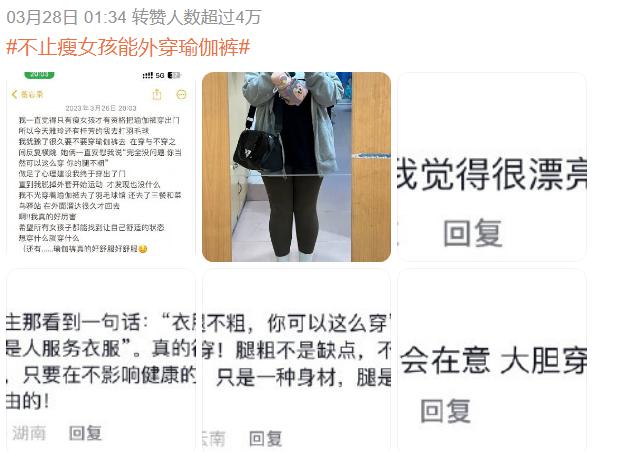 这很快成了励志热贴,还衍生出热门话题「不止瘦女孩能穿瑜伽裤」 。