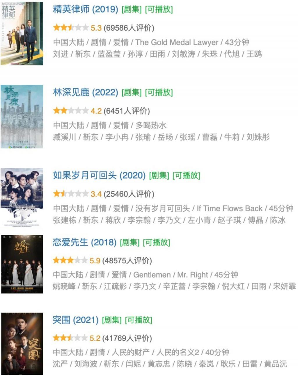 靳东主演的电视剧口碑一路下滑,豆瓣评分也始终徘徊在及格线之外。
