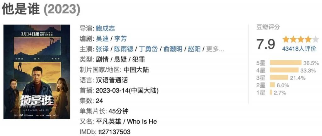 离开《狂飙》后,新剧《他是谁》如期上线在豆瓣斩获 7.9 的高分。