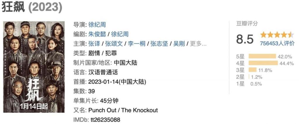 就比如刚从热搜上功成身退的《狂飙》,豆瓣 8.5 分,五星率超过 40% ,流量和口碑双收。