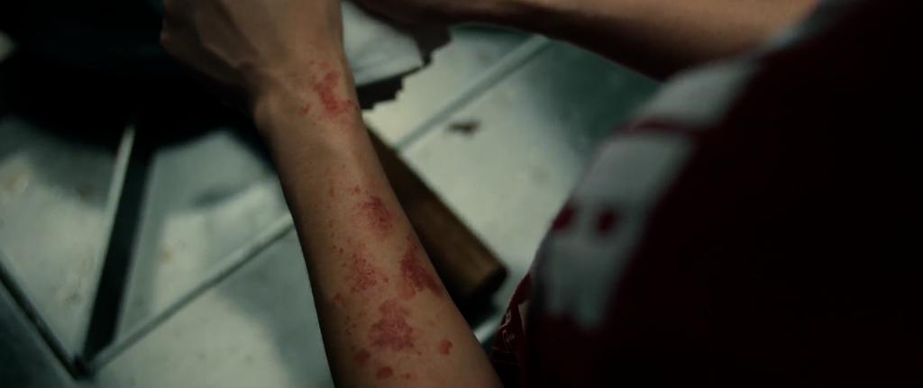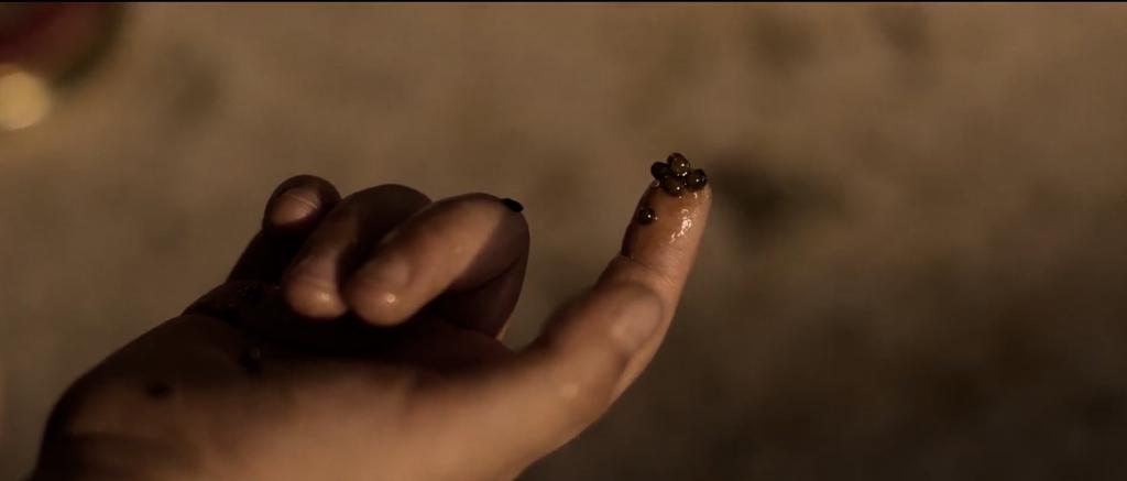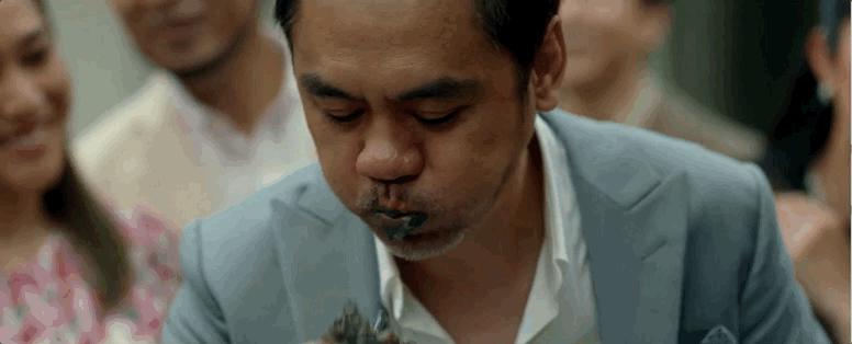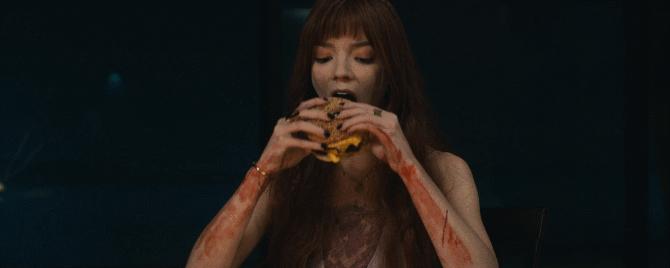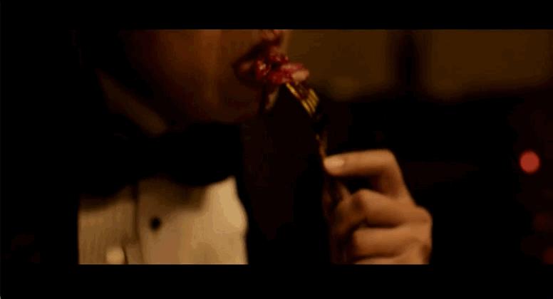酱汁四溢的画面,配上嘴部的特写,以及渗人的音乐,诡异的慢镜头。