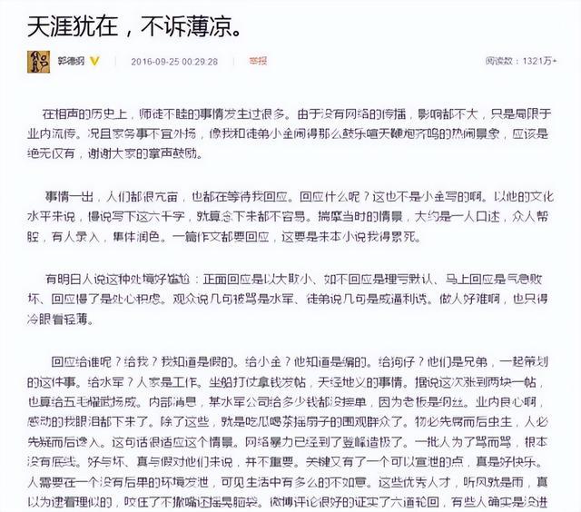 郭德纲被昔日爱徒伤透了心,洋洋洒洒写了一篇《天涯犹在,不诉薄凉》来回应曹云金的指责。