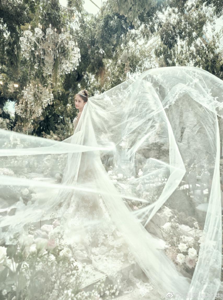 何超莲主纱来自 vera wang 定制,冠冕、耳环、对戒全部来自 Graff,冠冕共计 31 克拉左右,晚宴另一个冠冕约 26 克拉。