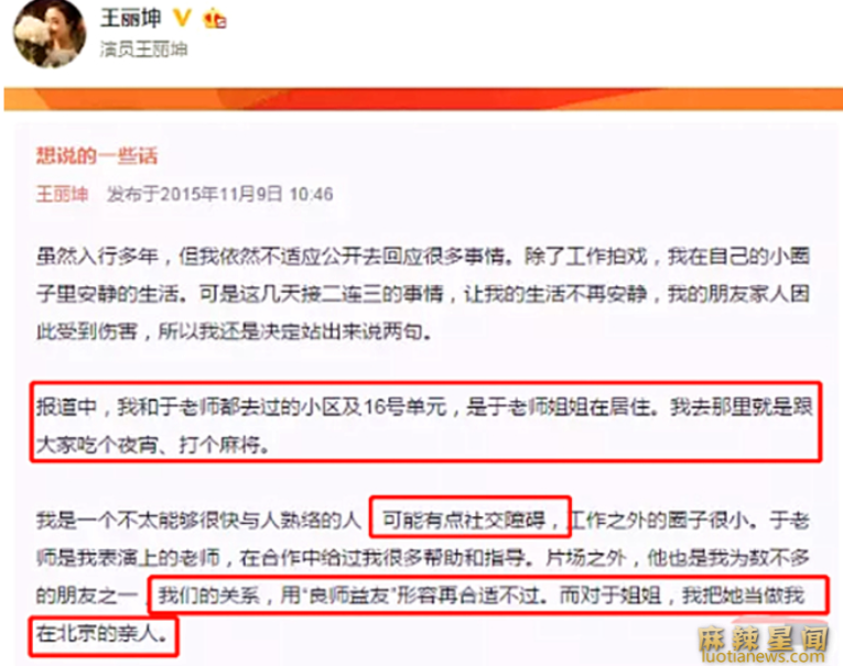 于和伟王丽坤事件 王丽坤回应称二人只是师友关系