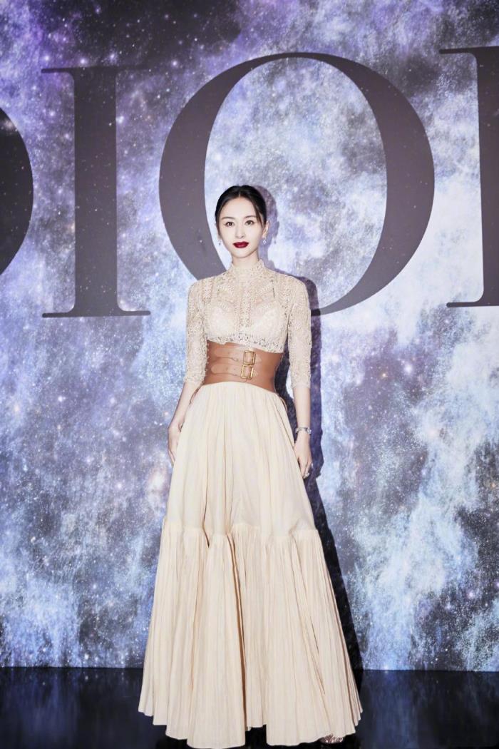 她出席活动时穿的这条浅色连衣裙的长度很长,甚至直接盖过了脚,这本来已经有拉长腿部的效果,但她仍然坚持继续用腰带来修饰腿部,导致她的腿看上去占了全身的大部分比例,所以当她单独一个人站在舞台上时,别人根本不会觉得她是小个子。