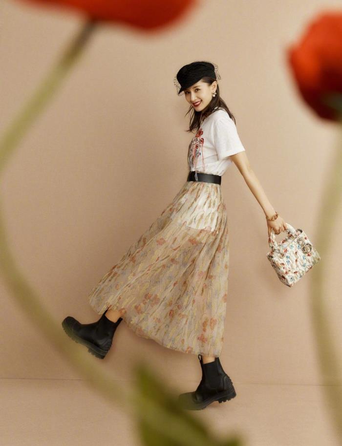 这套衣服也使用了同样的穿搭技巧,虽然这套并不是连衣裙,但是她将白色T恤塞进半透明印花纱裙中,再用黑色腰带进行连接,这样的造型比普通连衣裙更具个性感与时尚感。
