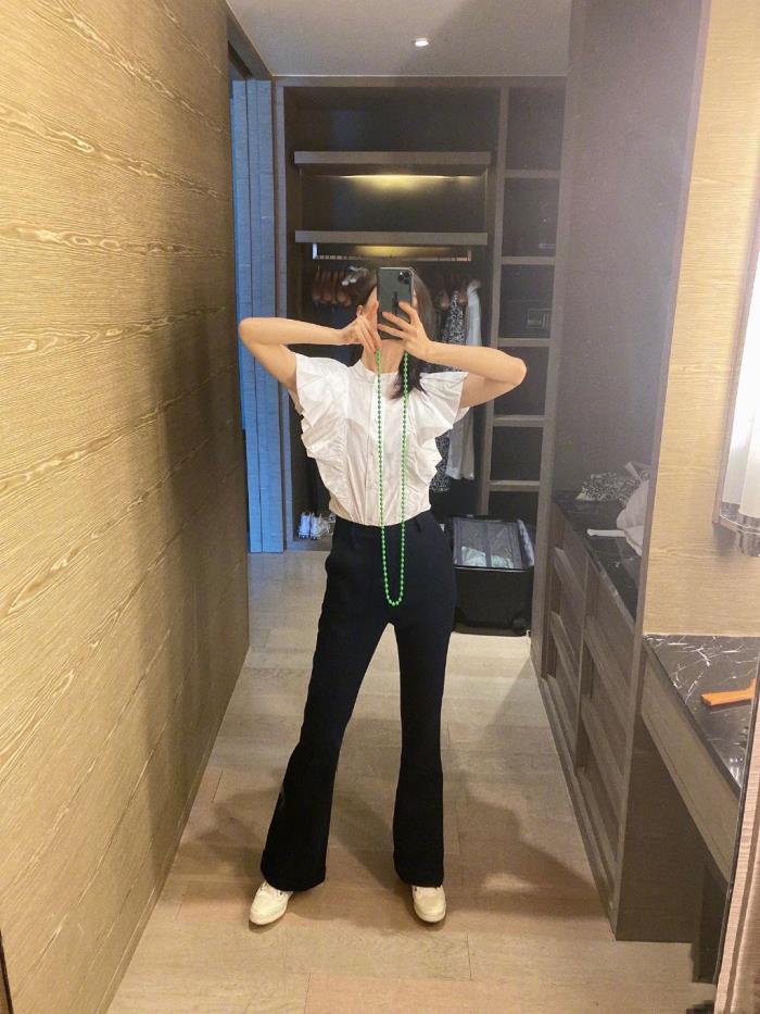 高腰裤或高腰裙也是个不错的选择,王子文身穿一件白色荷叶袖衬衣,搭配了一条黑色的高腰喇叭裤,这样的黑色裤子很显腿细,而且也能修饰小腿上的赘肉,适合腿型不完美或者小腿粗的女性。高腰裤在凸显腰身比例方面没有腰带明显,但确实也是百搭的显腿长单品。