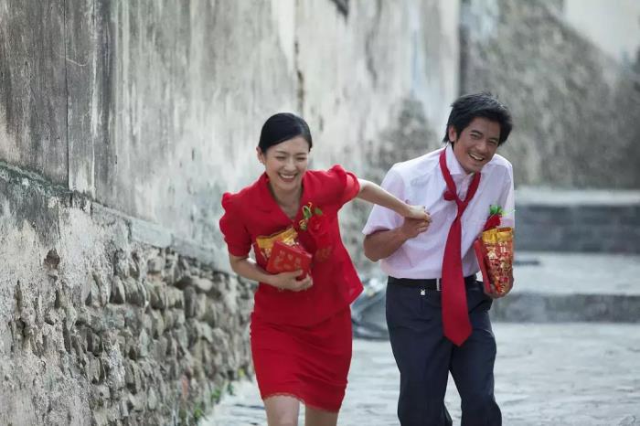 拿到红色的本本,两人换上新衣服,挨家挨户的发喜糖,向村里人宣布他们的爱情。