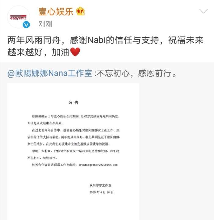6月16日,欧阳娜娜工作室发文称与壹心合约到期,正式解约。随后,壹心娱乐也发博祝愿欧阳娜娜今后的事业顺利。看多了互撕的消息之后,才发现经纪公司和艺人可以和平解约太难得了~