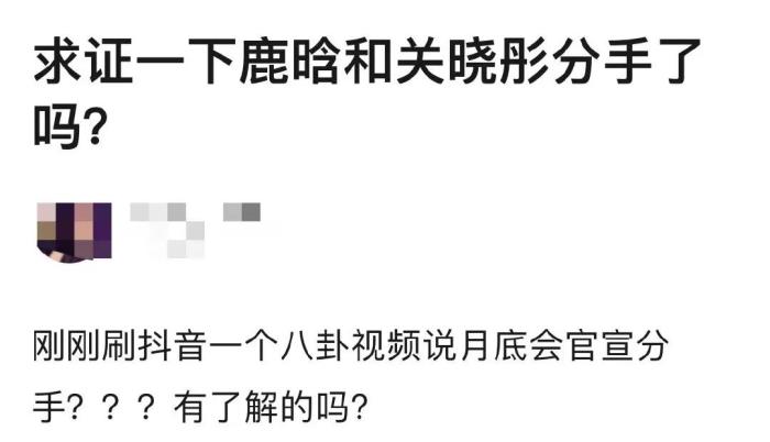有网友在某网站发帖子求证鹿晗和关晓彤是不是会分手,自己看到某八卦视频上写,两人月底将官宣分手。
