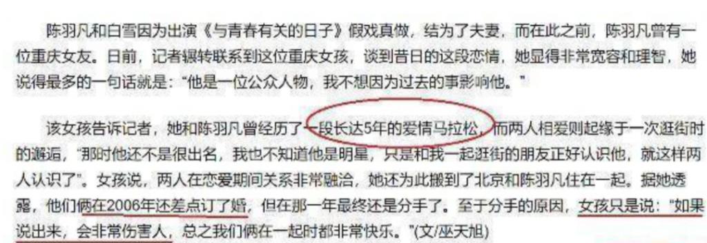 而当时的陈羽凡一直有相恋 5 年的女朋友,甚至在白百何毕业的 2006 年还一度谈婚论嫁,接受采访时这位前女友也是话里有话,但最终还是没有多说什么。