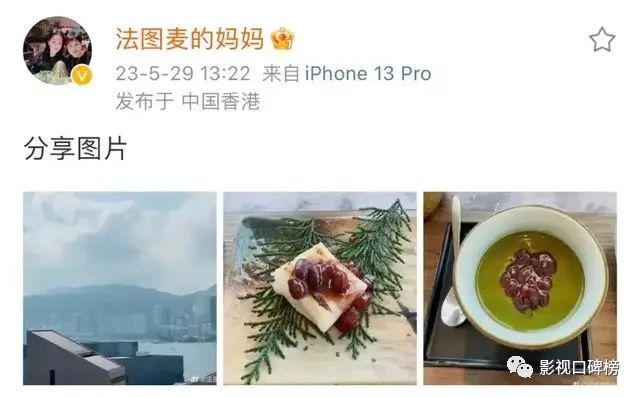 著名主持人李咏妻子哈文在社交平台上更新了一则动态,没有文字,只是 3 张配图,2 张美食,1 张风景。