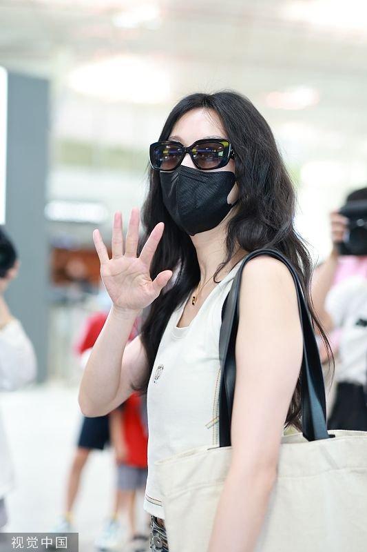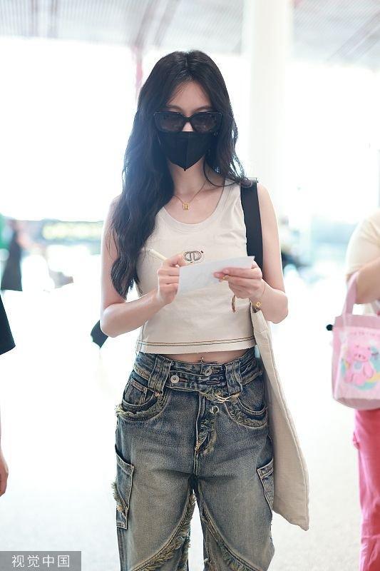新浪娱乐讯 2023 年 6 月 21 日,北京,张俪身穿背心搭配牛仔裤现身首都机场。(图源视觉中国)