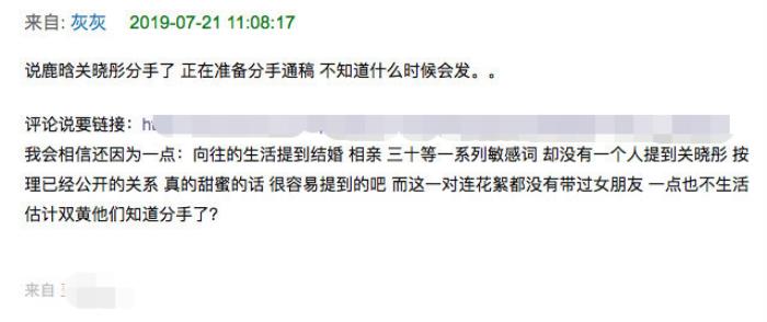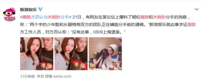 21日,有网友在某论坛上爆料了疑似鹿晗和关晓彤分手的消息,称:“两个字的少年脸和长腿格格双方的团队正在铺垫分手前的通稿。”新浪娱乐就此事求证鹿晗方工作人员,对方否认称:“没有此事,0809上海堡垒。”