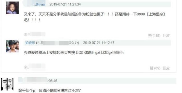 但是,这一的爆料并没有真凭实据,随口杜撰的可能性很高,所以,粉丝们是不买账的,反而是骂声一片,斥责爆料者散布假消息:“信个p,我猜还是匿名爆料对不对?”、“又来了,天天不是分手就是结婚的作为粉丝也累了!!!”