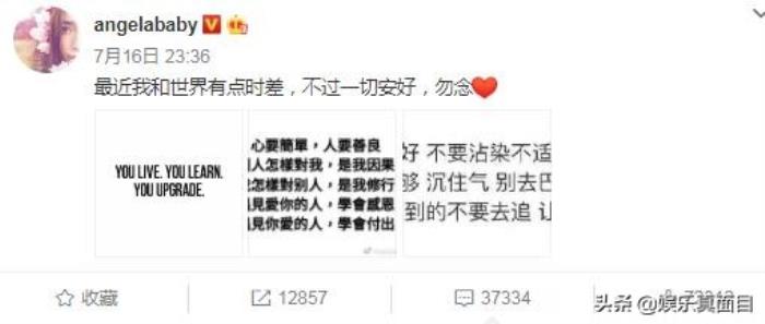 四天之后,也就是昨天深夜,Angelababy突然更新微博,内容别有深意。微博配文为:最近我和世界有点时差,不过一切安好,勿念。