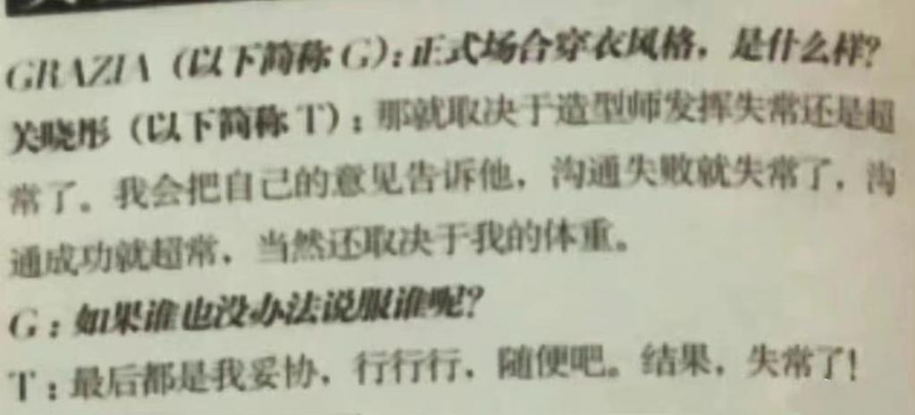 不少网友又扒出了一次关晓彤的采访,其中有聊到关于造型的话题,关晓彤坦言说自己在正式场合穿衣风格取决于造型师发挥失常还是超常,她将自己的意见告诉造型师,如果沟通失败了就失常,沟通成功就超常。关晓彤还透露说最后都是她向造型师妥协,结果就是造型失常了。此话一出,不少关晓彤的粉丝批评这位造型师真是够大牌。