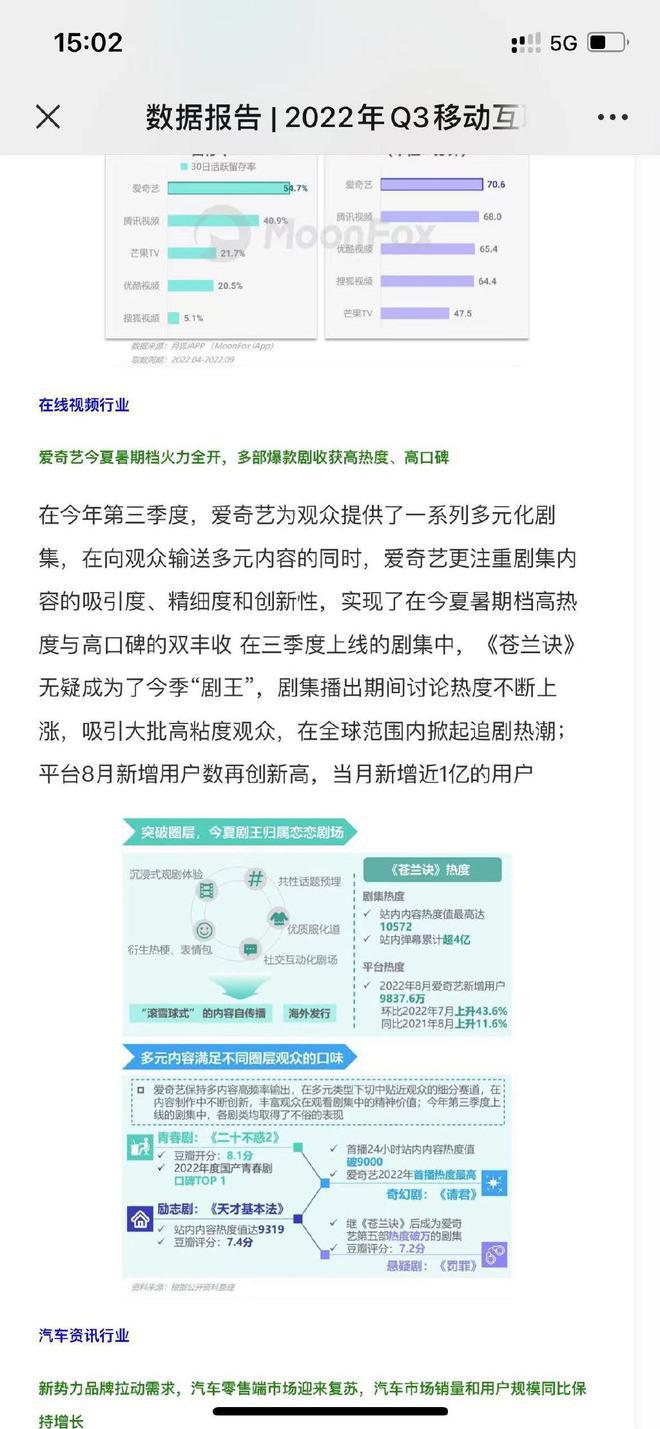 网易娱乐 11 月 18 日报道 据月狐数据 2022 年 Q3 移动互联网行业数据研究报告,今年第三季度爱奇艺实现在线视频行业内用户增长速度最快,在三季度上线的剧集中,《苍兰诀》成为今季 " 剧王 ",剧集播出期间吸引大批高粘度观众,平台 8 月新增用户数再创新高,当月新增近 1 亿的用户。
