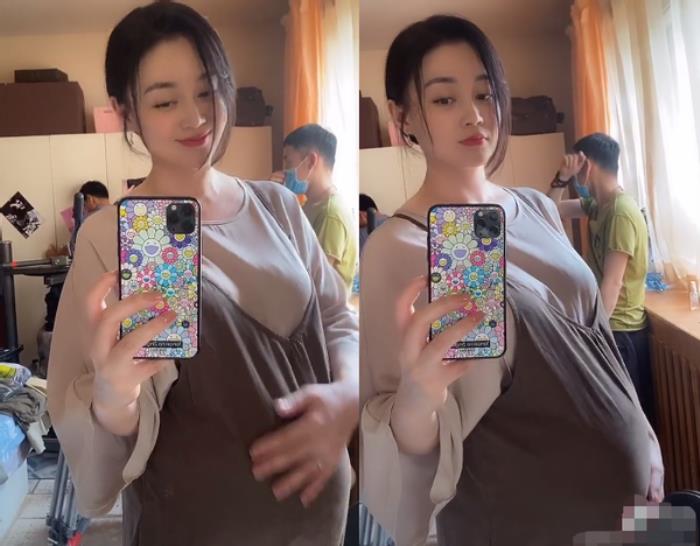 只见关婷娜一副孕妇装扮,一只手摸着高高隆起的腹部,另一只手举起手机,面带微笑地对镜自拍。不过视频中的关婷娜除了腹部隆起外身材并没有大走样,脖子纤细,锁骨也很是明显。从视频背景来看,自拍场所应该是在剧组,身后还有工作人员和拍摄设备。