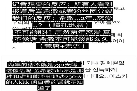 而听到金希澈恋爱两年消息的粉丝们的回应也真是太有趣了些,纷纷表示这则消息简直太荒唐了,她们的希澈哥哥怎么可能会是谈那么久恋爱的人,不可能,要是说两周或是两个月她们还会相信,造谣者明显都不了解金希澈,太让人无语了。