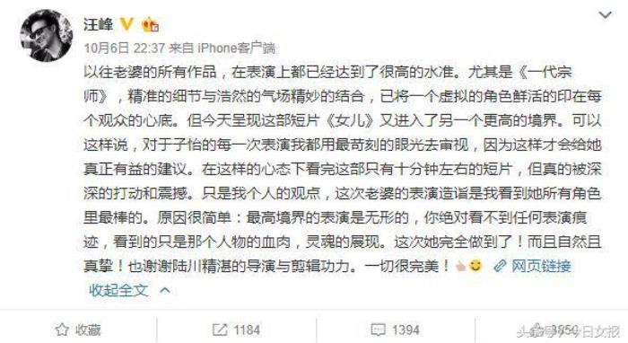 “以往老婆的所有作品,在表演上都已经达到了很高的水准。尤其是《一代宗师》,精准的细节与浩然的气场精妙的结合,已将一个虚拟的角色鲜活的印在每个观众的心底。但今天呈现这部短片《女儿》又进入了另一个更高的境界。可以这样说,对于子怡的每一次表演我都用最苛刻的眼光去审视,因为这样才会给她真正有益的建议。在这样的心态下看完这部只有十分钟左右的短片,但真的被深深的打动和震撼。只是我个人的观点,这次老婆的表演造诣是我看到她所有角色里最棒的。原因很简单:最高境界的表演是无形的,你绝对看不到任何表演痕迹,看到的只是那个人物的血肉,灵魂的展现。这次她完全做到了!而且自然且真挚!也谢谢陆川精湛的导演与剪辑功力。一切很完美!”