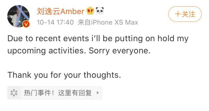 Amber在事发后第一时间发微博称由于最近发生的事情,我将推迟即将举办的活动,对不起大家,谢谢大家关心。