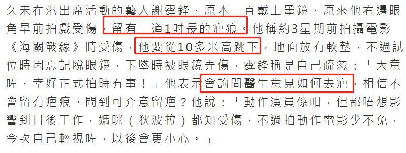事实上,谢霆锋拍戏一直很拼命,很多高难度动作戏都亲自上阵,以至于经常受伤。