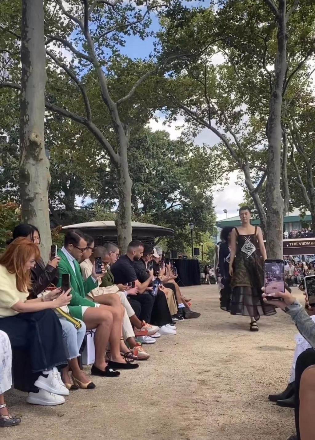从画面来看,当天欧洲天气晴好,Jane 受邀来参加某室外秀场,她坐在第一排,用手机记录下了模特走秀的精彩画面。看秀结束后,Jane 并没有立马离去,而是和一位异性好友在秀场开心合影。