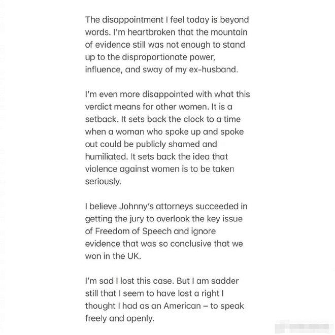 据悉,此前艾梅伯对案件判决表示失望,她称:" 堆成山的证据依然无法对抗我的前夫那巨大的权力、影响力和势力。我更失望的是这个判决对别的女性意味着什么,这是倒退,这让时间倒退回女性发声可能会被公开羞辱的年代,这让‘针对女性的暴力会被严肃对待’的观念倒退了。"