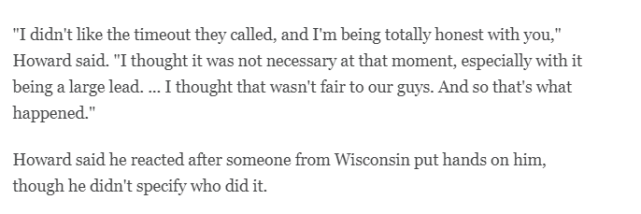 霍华德不爽的原因,在于威斯康星大学在比赛还剩15秒时还请求了一次暂停,当时威斯康辛大学已经领先15分,胜券在握。“坦白说,我不喜欢他们叫的暂停,”霍华德赛后说,“我认为那时候已经没有必要了,尤其是在领先优势这么大的情况下……我认为这对我们的球员不公平,事情就是这样。”